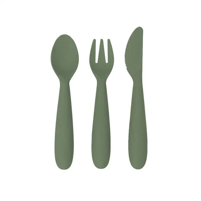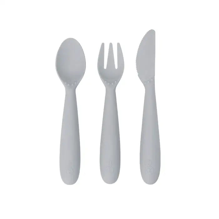 Learning self-feeding skills with utensils is an important developmental milestone. The ezpz Happy Utensils are designed to help older toddlers / preschoolers independently eat with a spoon and fork, and safely practice using a knife (spreading + cutting).